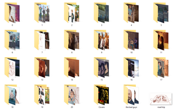 The first zip download contains a folder for each of the 21 chapters, including full-size illustrations, flat colors, linearts, and sketches (174 total files). The second two zip downloads include 22 MP4 videos for each full illustration process.